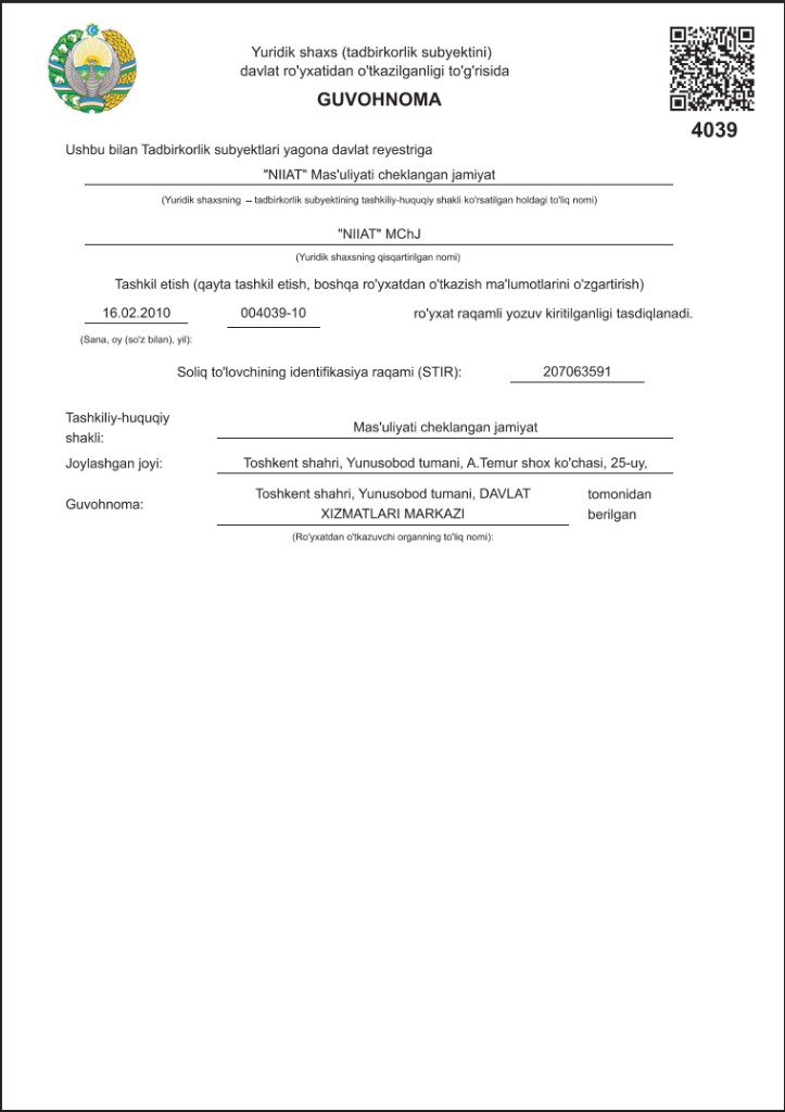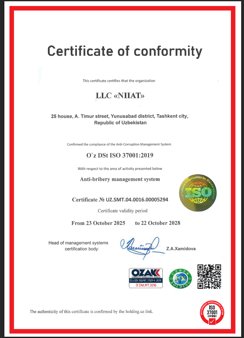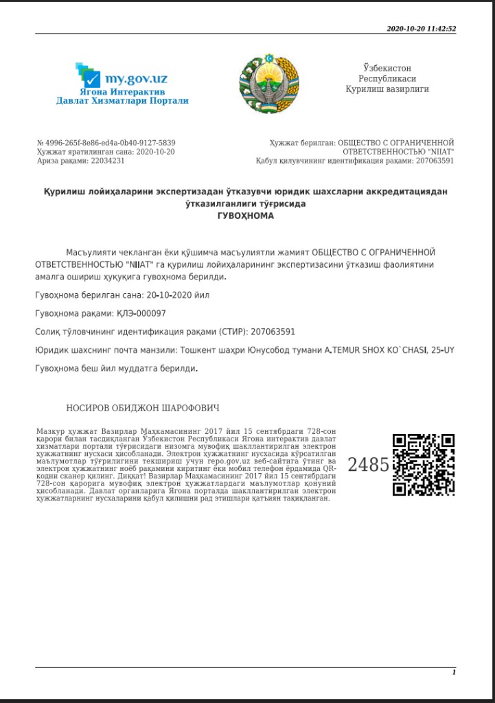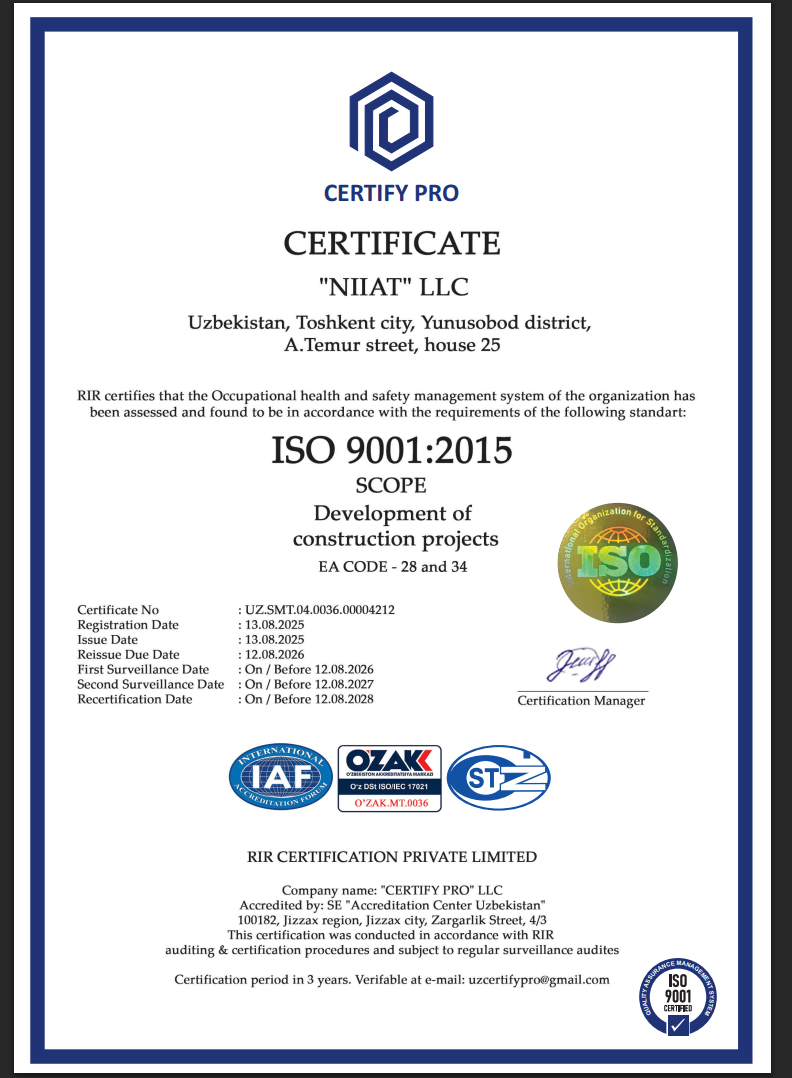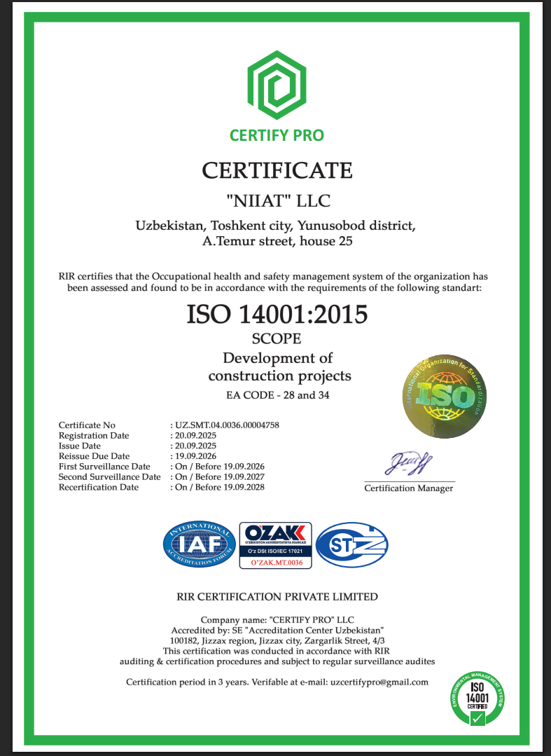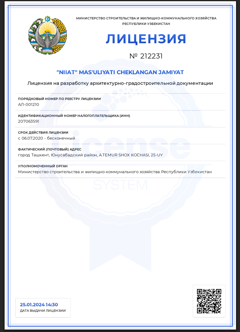 Инжиниринговая и консалтинговая компания Niiat, основанная в 2010 году, является авторитетным лицензированным разработчиком и экспертом в градостроительной сфере Узбекистана.